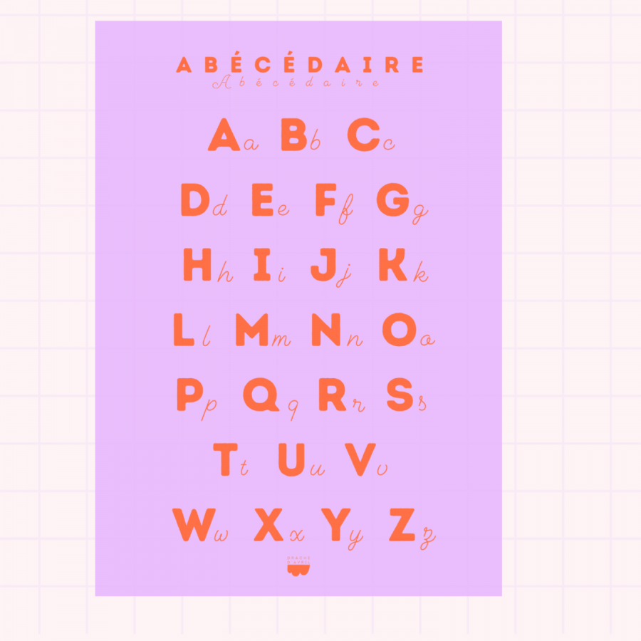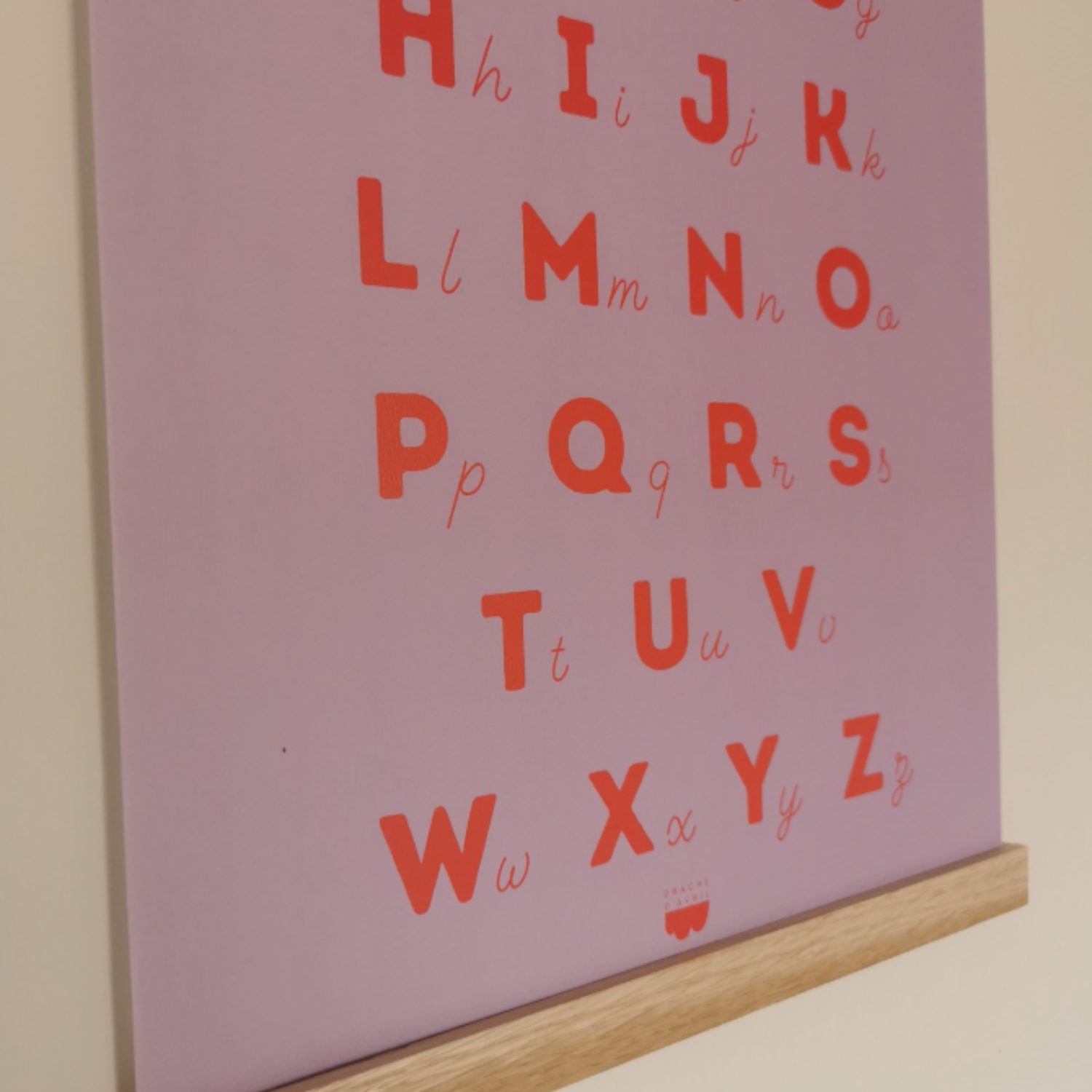 Un abécédaire ludique et coloré en rose et rouge, format A3 sur papier épais texturé. Décore et apprend les lettres aux enfants avec plaisir.
