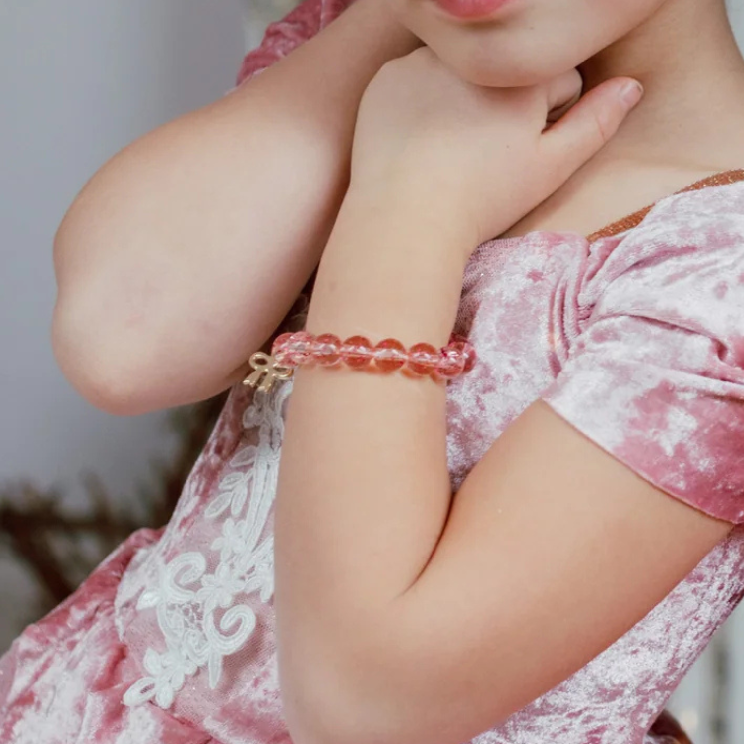 Un bracelet raffiné qui apporte une touche d’élégance à la tenue des enfants. Composé de perles rondes cristal et d’accents rouges pailletés, il est sublimé par trois petits nœuds dorés scintillants. Léger et festif, il complète à merveille les tenues de cérémonie ou simplement pour briller au quotidien.