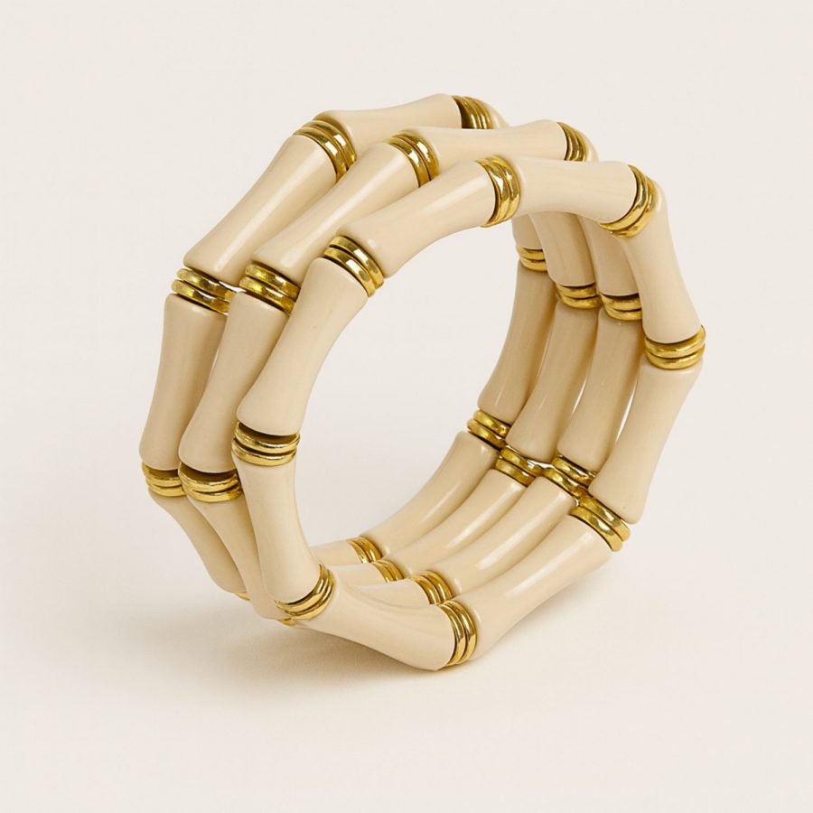Apportez une touche chic et originale à vos tenues avec ce bracelet jonc asymétrique beige. Composé de segments façon bambou et rehaussé de finitions dorées, il offre un look élégant et moderne. Grâce à son système élastique, il s’adapte facilement à tous les poignets et se porte aussi bien seul qu’en accumulation.