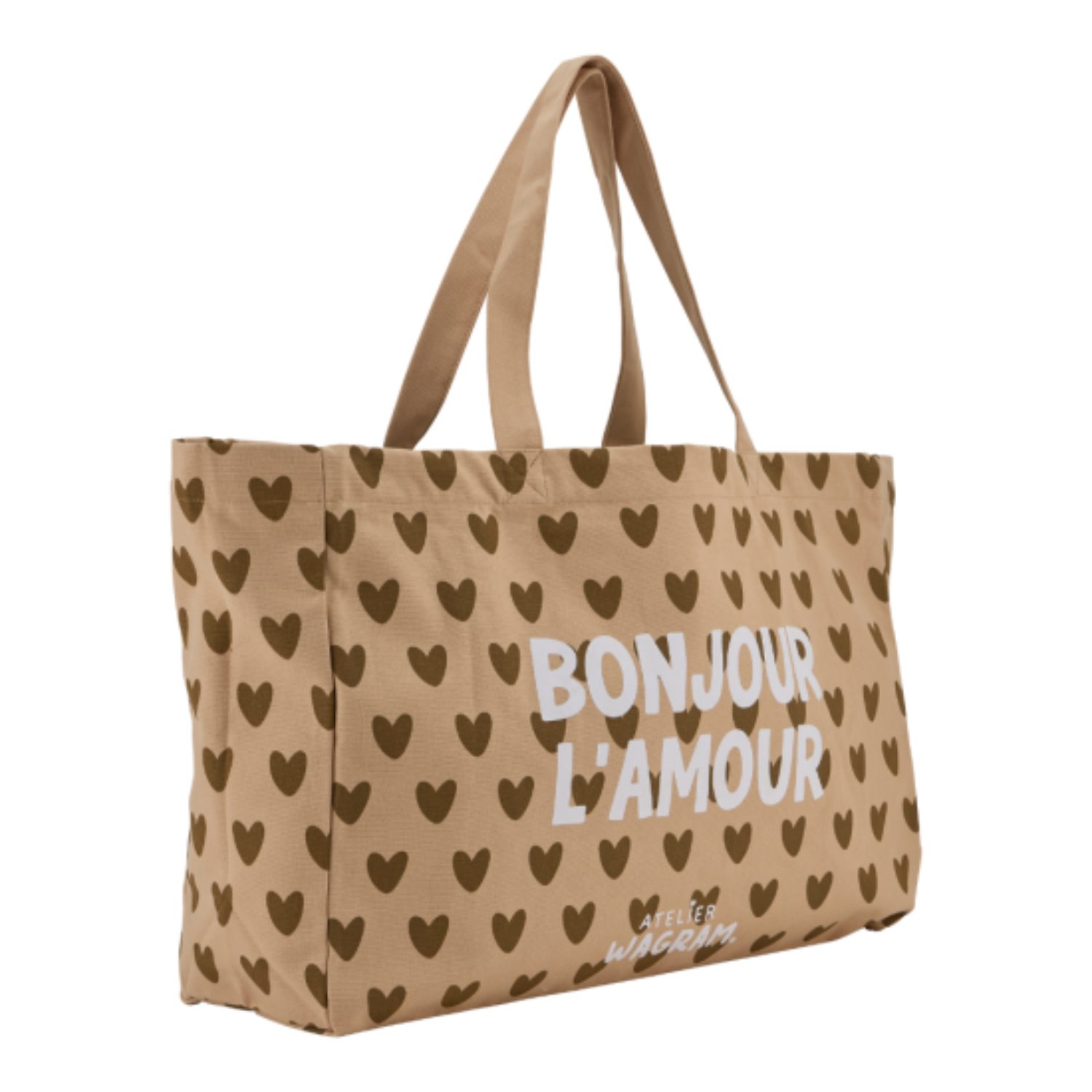 Ce cabas XL « Bonjour l’Amour » en toile de coton t’accompagne partout : plage, boulot, courses ou week-end. Solide, doublé, avec une poche zippée ultra pratique et un message plein de good vibes . Le genre de sac qu’on garde longtemps (et qu’on pique à sa pote).
