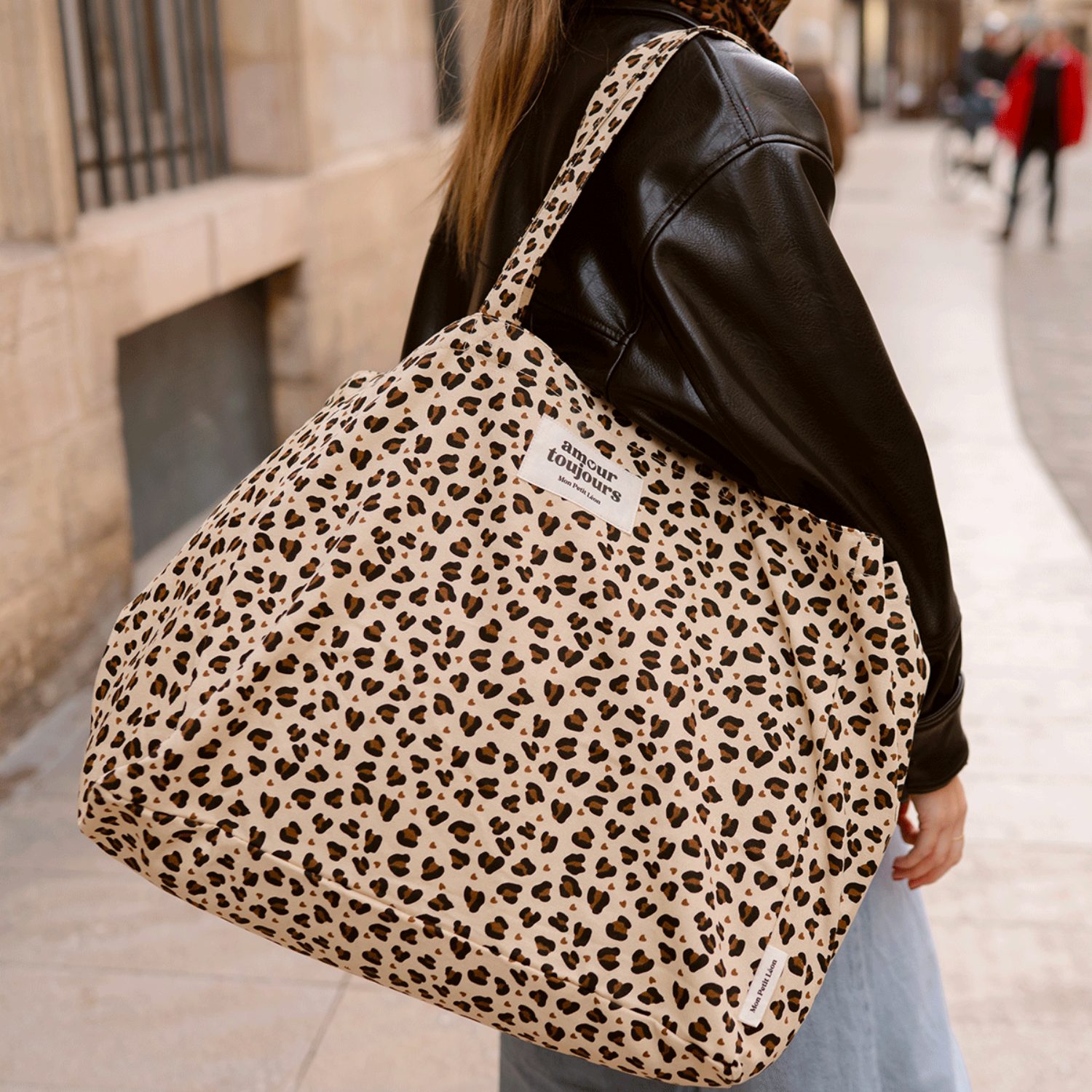Ses anses longues permettent un porté confortable, même bien chargé, tandis que sa poche intérieure zippée garde à portée de main les petits indispensables. Avec son motif léopard cœur et son mantra “amour toujours”, il apporte une touche tendance et feel-good à chaque sortie.