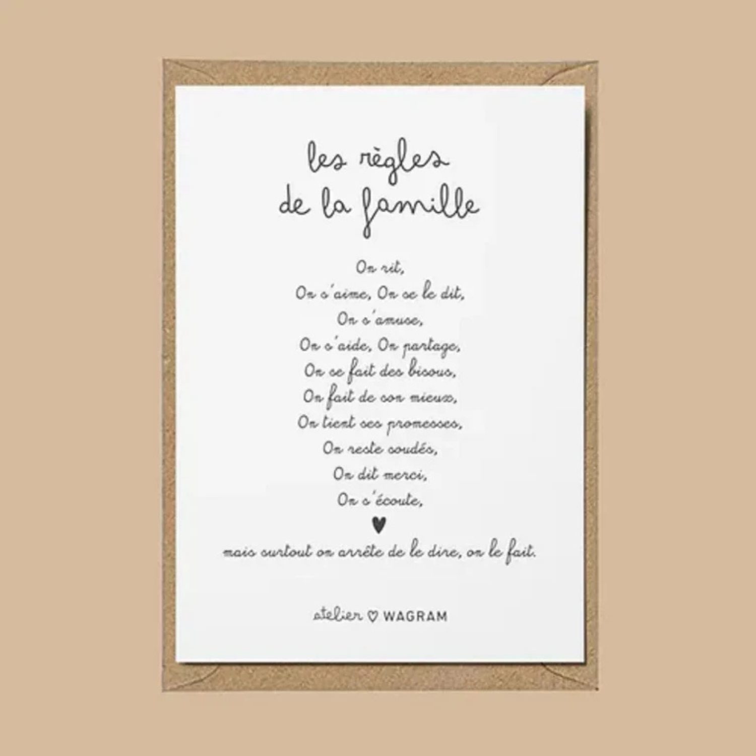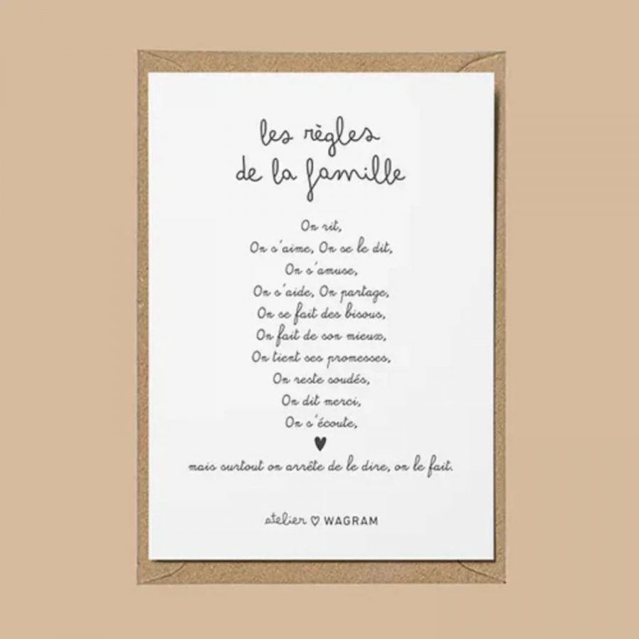 Une jolie carte décorative pleine de sens et de bienveillance. La carte Les règles de la famille rassemble de beaux mots forts qui résonnent au quotidien. À offrir, à afficher ou à collectionner, elle trouve facilement sa place dans une chambre, un salon ou un bureau.