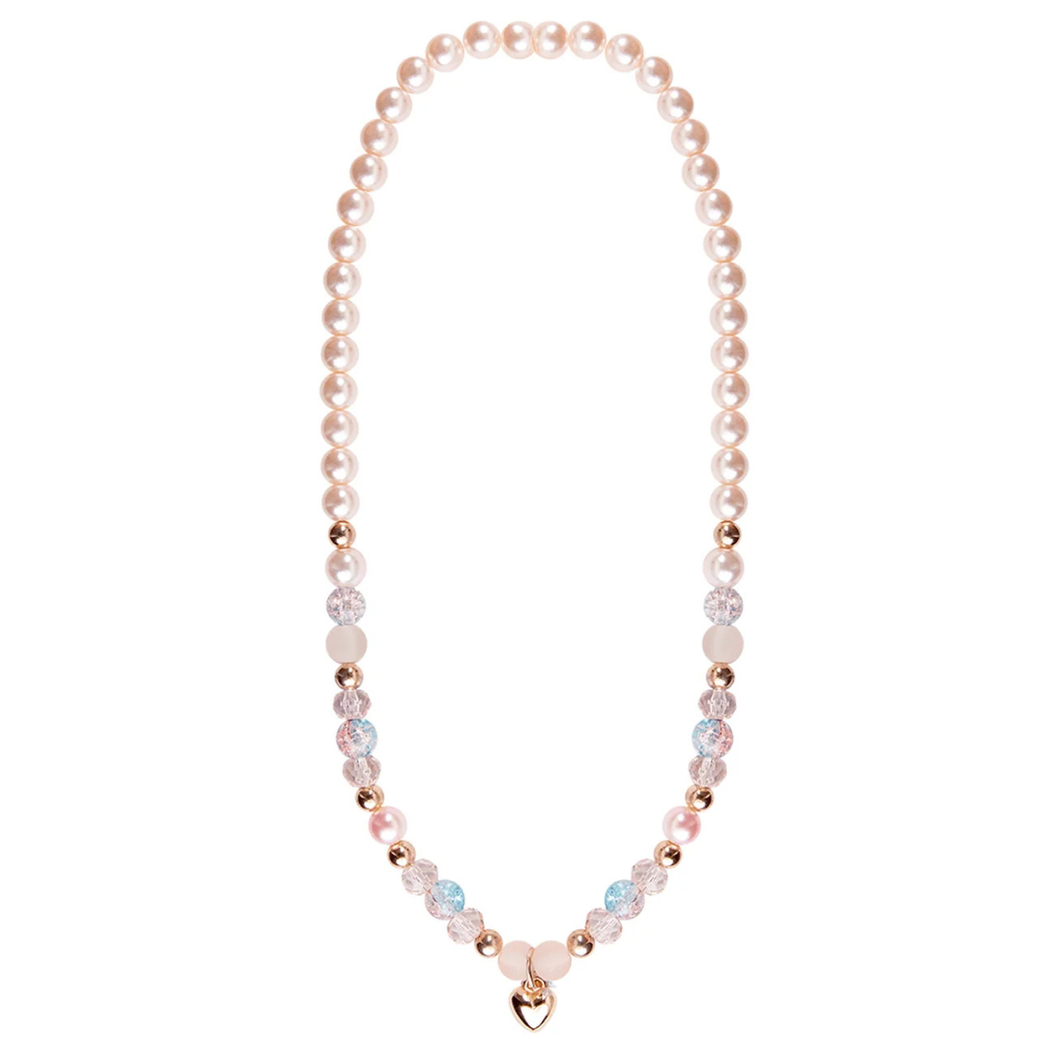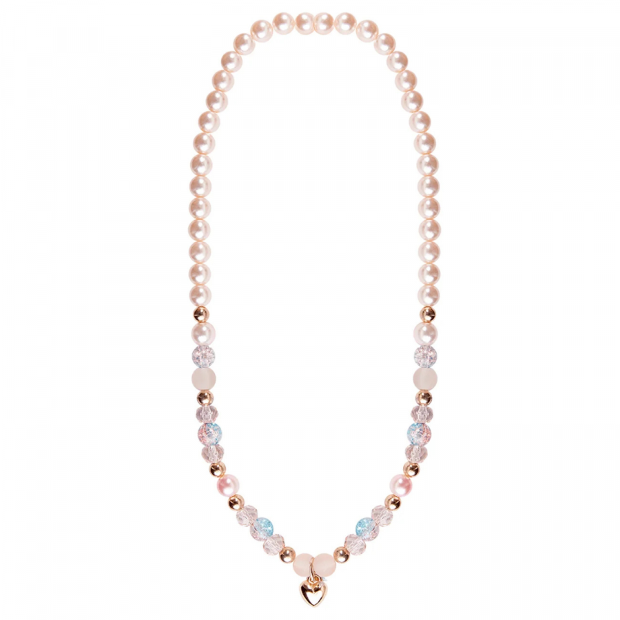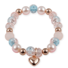 - Collier composé de perles rose, bleu et or rosé, agrémenté d’un pendentif cœur brillant.
