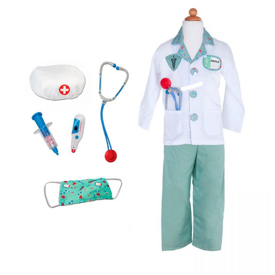 - Contenu : blouse, pantalon, masque, chapeau, stéthoscope, seringue, porte-nom et thermomètre (8 pièces)