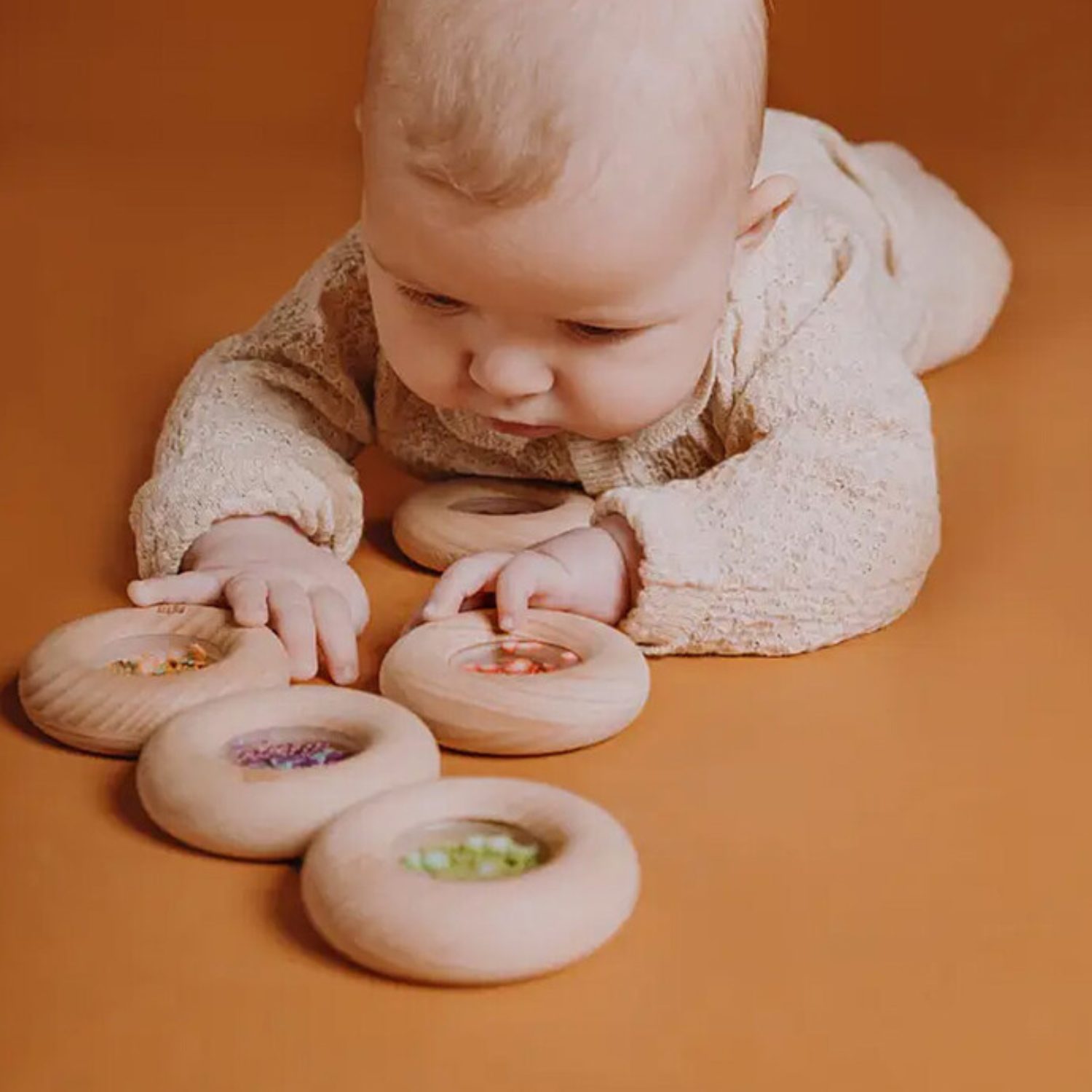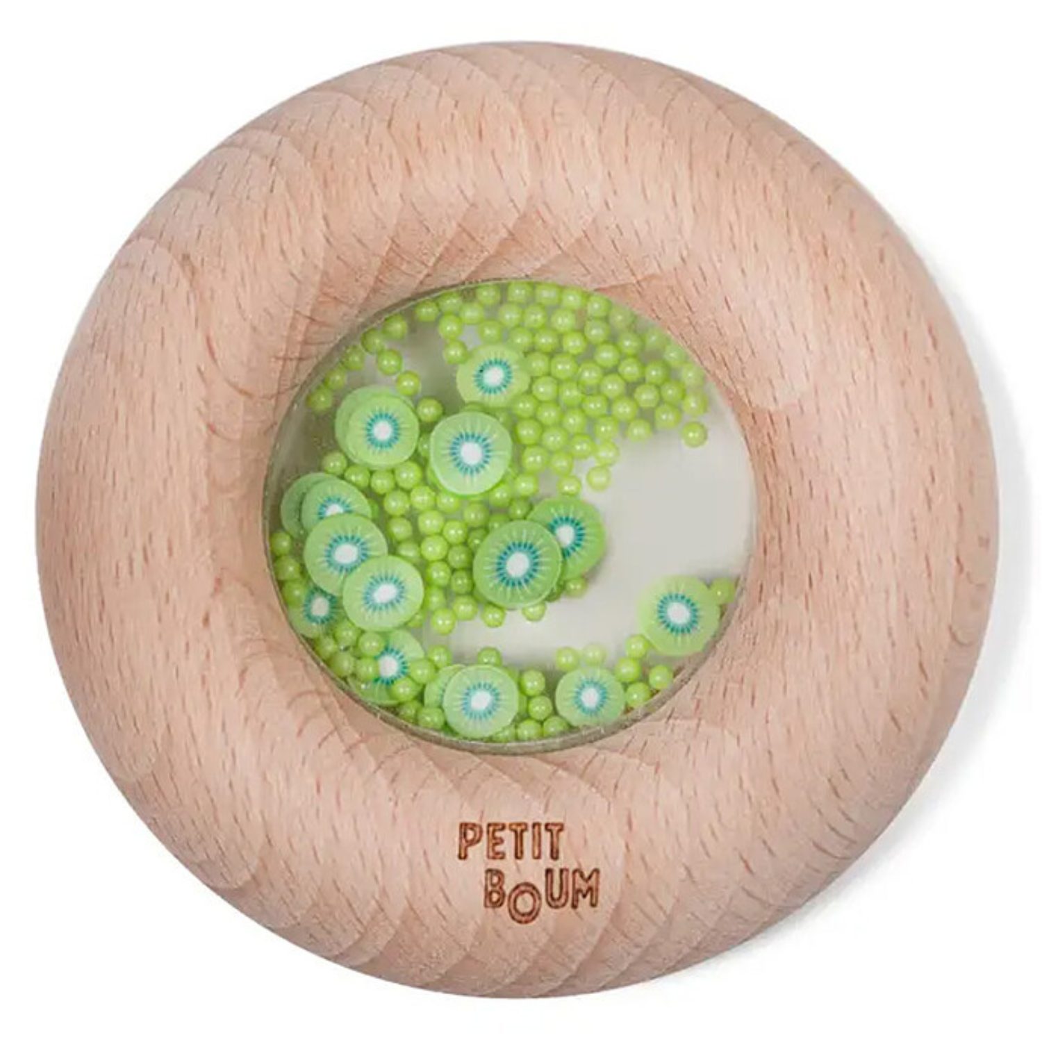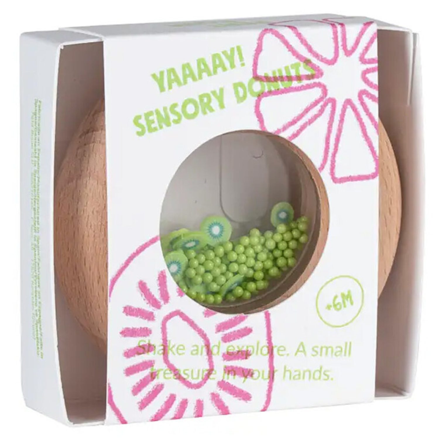Un beignet à croquer… mais version jouet ! Ce donut sensoriel tout mignon en bois de hêtre est parfait pour les petites mains (et les petites dents). Avec ses billes colorées et ses mini citrons à l’intérieur, il attire l’œil, stimule les sens et amuse bébé dès 6 mois. Il fait un petit bruit rigolo quand on le secoue, et sa forme arrondie est idéale à attraper, secouer, mordiller ou observer. Ludique, sain, naturel : un jouet sensoriel au top pour éveiller bébé en douceur.
