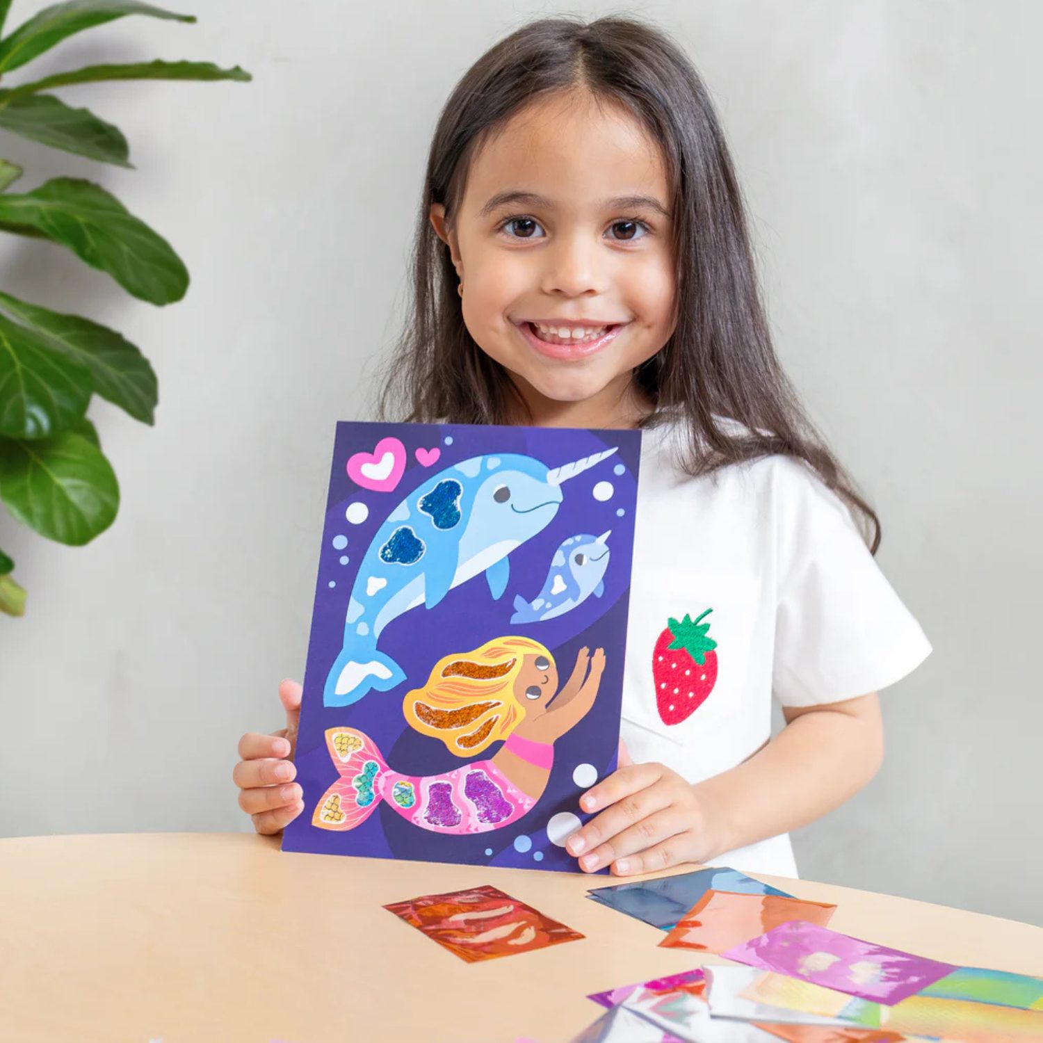 Plongez dans un univers sous-marin féerique ! Grâce à cet atelier, les enfants personnalisent des illustrations de sirènes, narvals et hippocampes avec des feuilles métallisées. Une activité simple, sans écran, qui développe créativité et motricité fine.