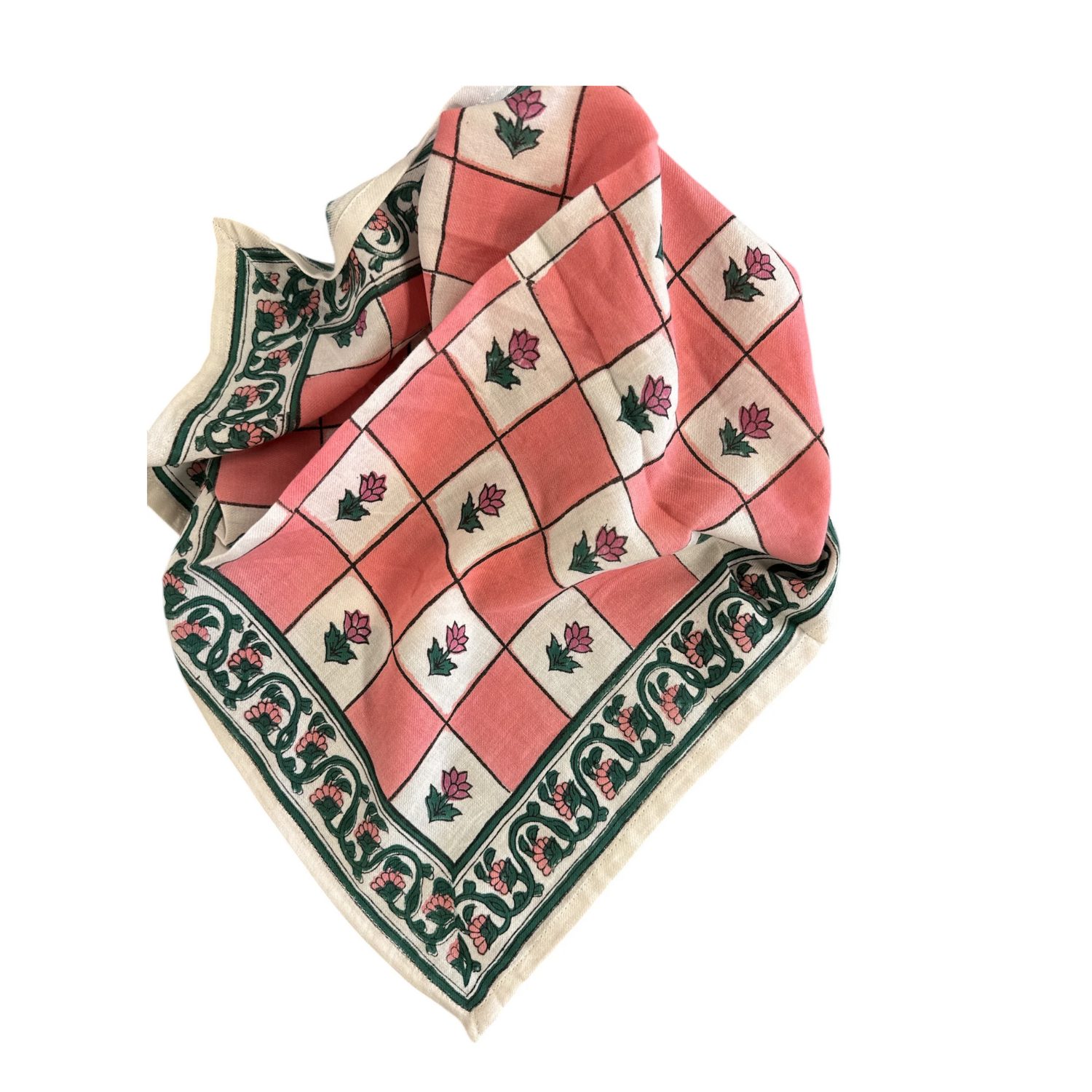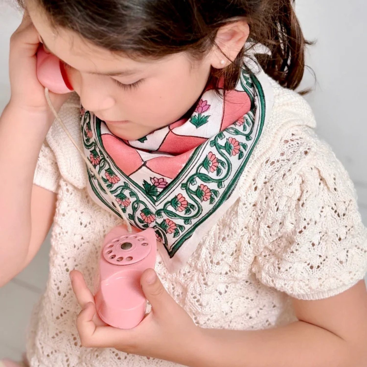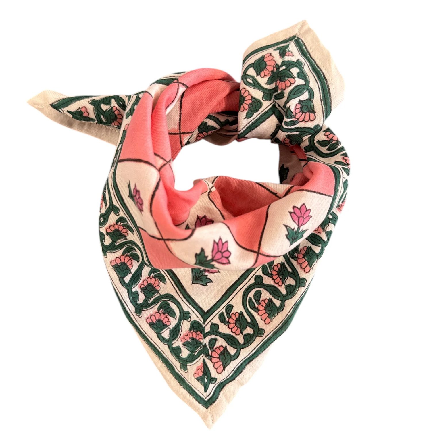 Ce joli foulard 100% coton aux teintes vertes et roses est orné de fleurs délicates imprimées à la main. Grâce à sa petite taille, il se glisse partout et accompagne les enfants (et les grands !) au quotidien. Confectionné artisanalement en Inde, il est aussi beau qu’unique .