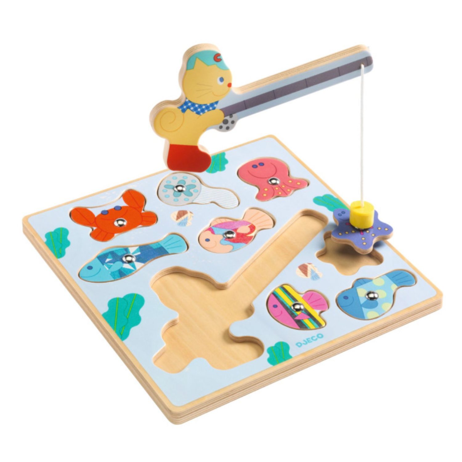 Grâce à la canne à pêche aimantée tenue par un petit chat, l’enfant attrape les poissons un à un avant de les replacer dans leur emplacement. Une activité ludique et sensorielle qui développe la motricité fine, la concentration et la coordination œil-main.