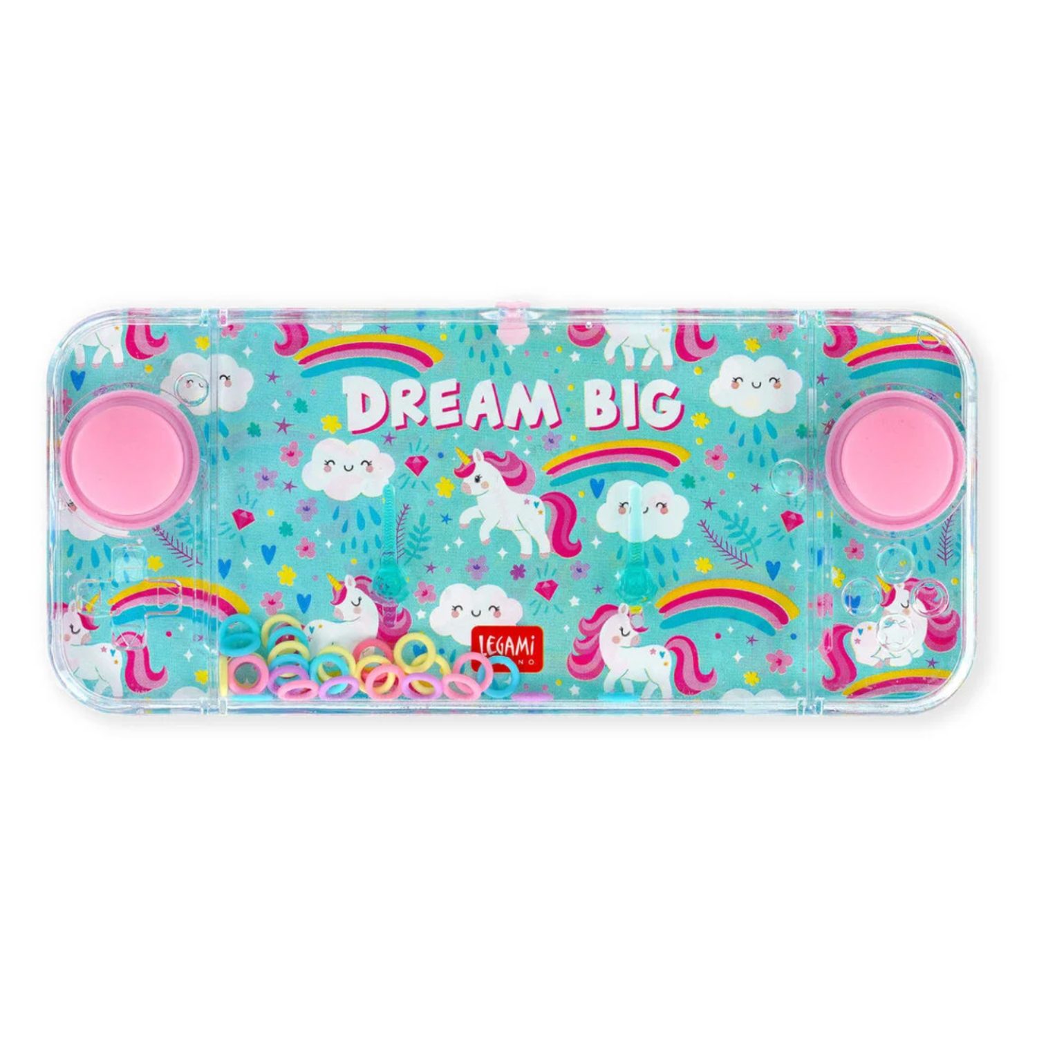 Un petit jeu rétro comme on les adore ! Ce mini jeu à eau motif Licorne occupe les enfants en un clin d’œil : on appuie sur les boutons, on fait bouger les anneaux et on tente de tous les faire atterrir sur les cibles.