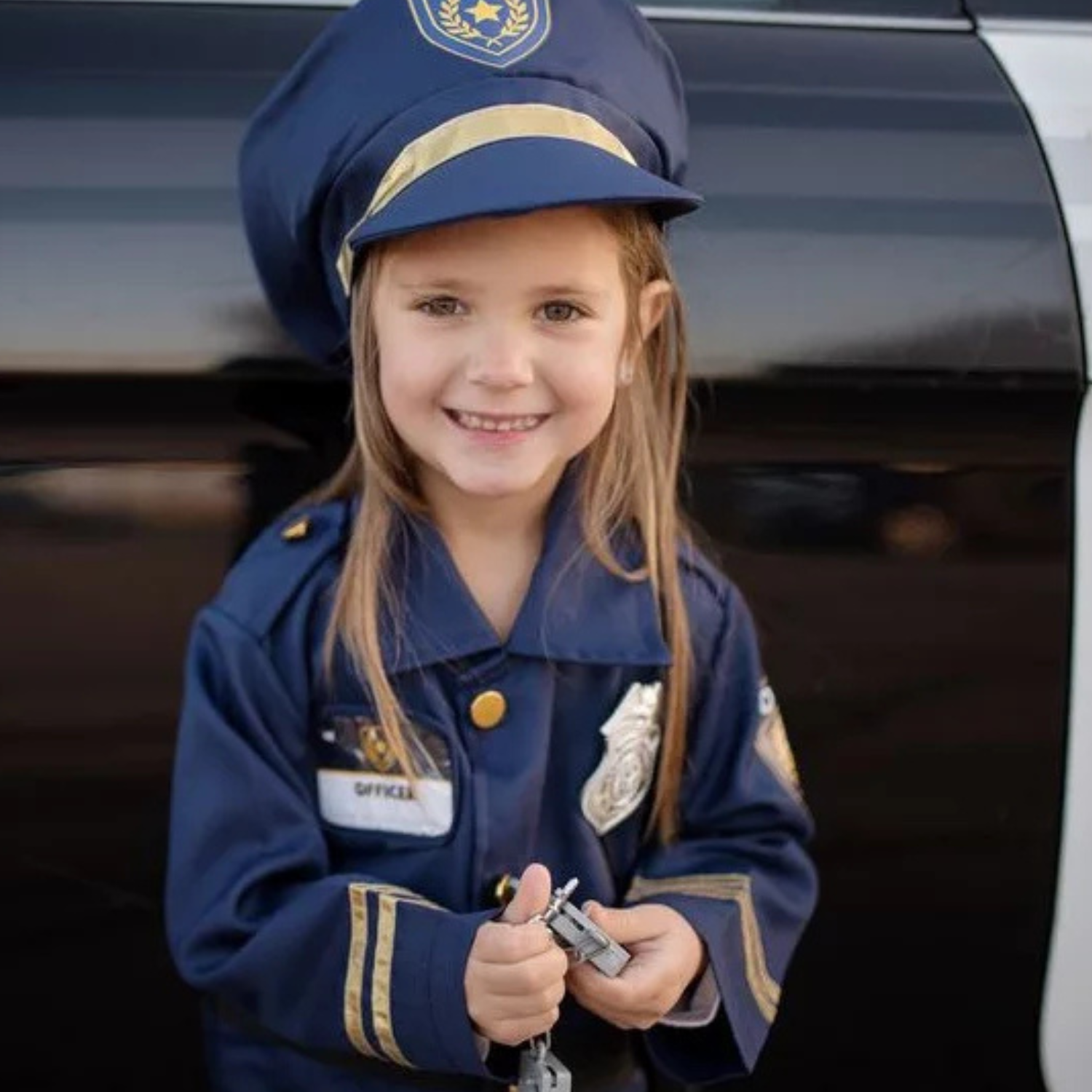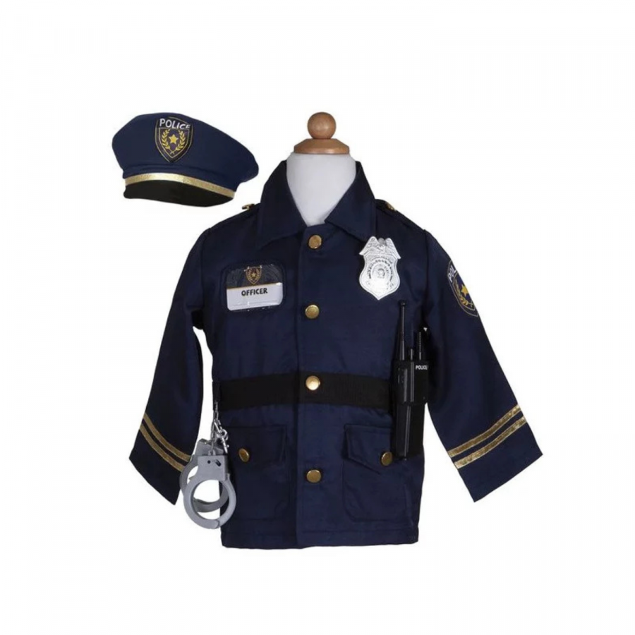 - Costume de policier complet avec 6 pièces : veste, casquette, menottes, talkie-walkie, badge, badge nominatif
