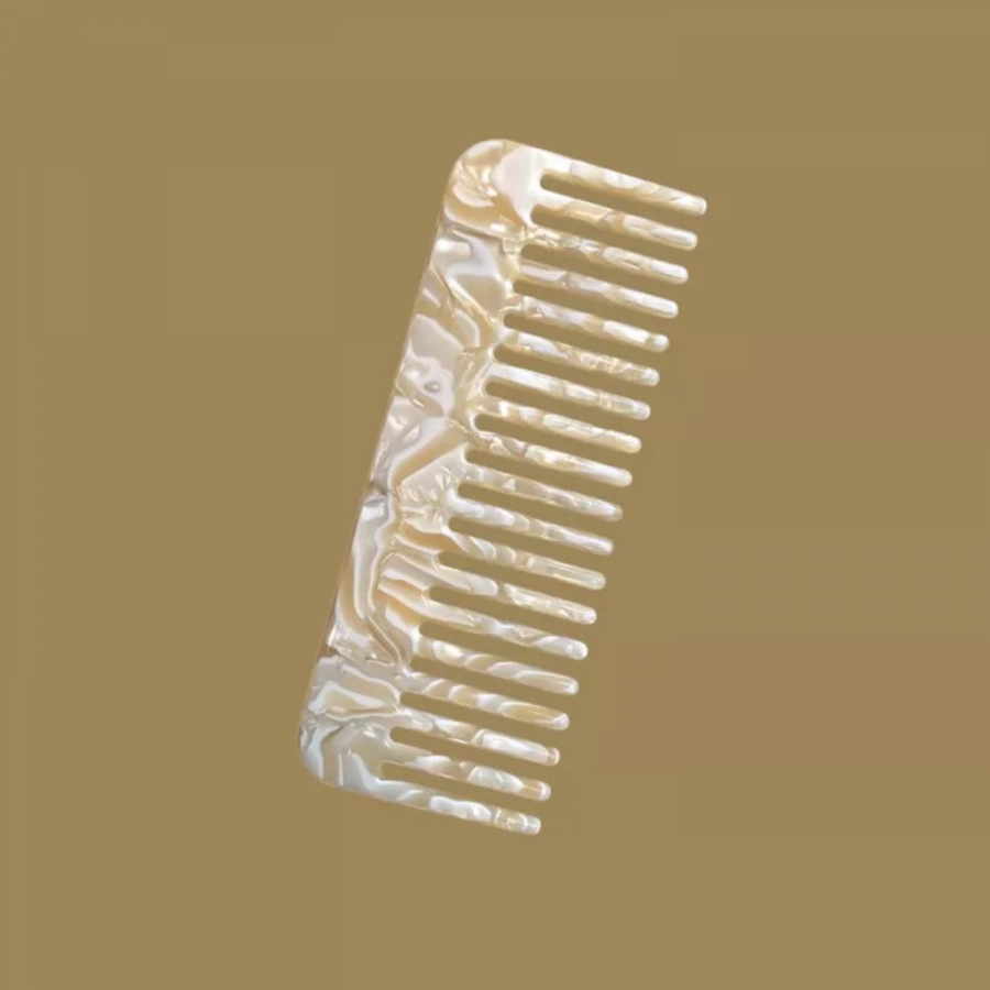 Ce peigne large en nacre écru démêle en douceur tous les types de cheveux, même les plus rebelles.