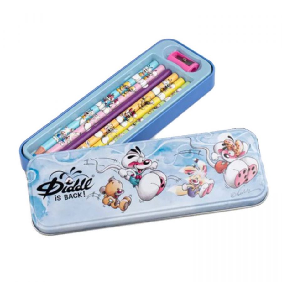 Plumier métal Diddl avec 6 crayons de couleur. Boîte rigide illustrée, parfaite pour l’école ou les loisirs créatifs. Dès 3 ans, charmant et pratique.