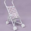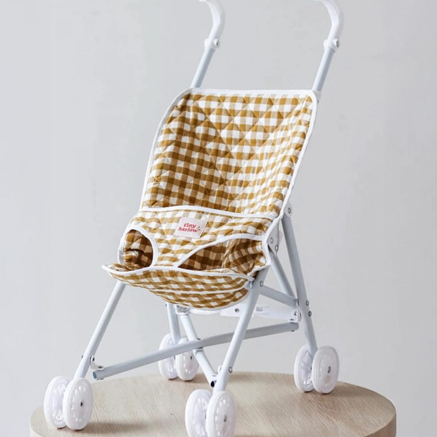 • Poussette pour poupée au motif vichy moutarde, au look rétro et plein de charme.
