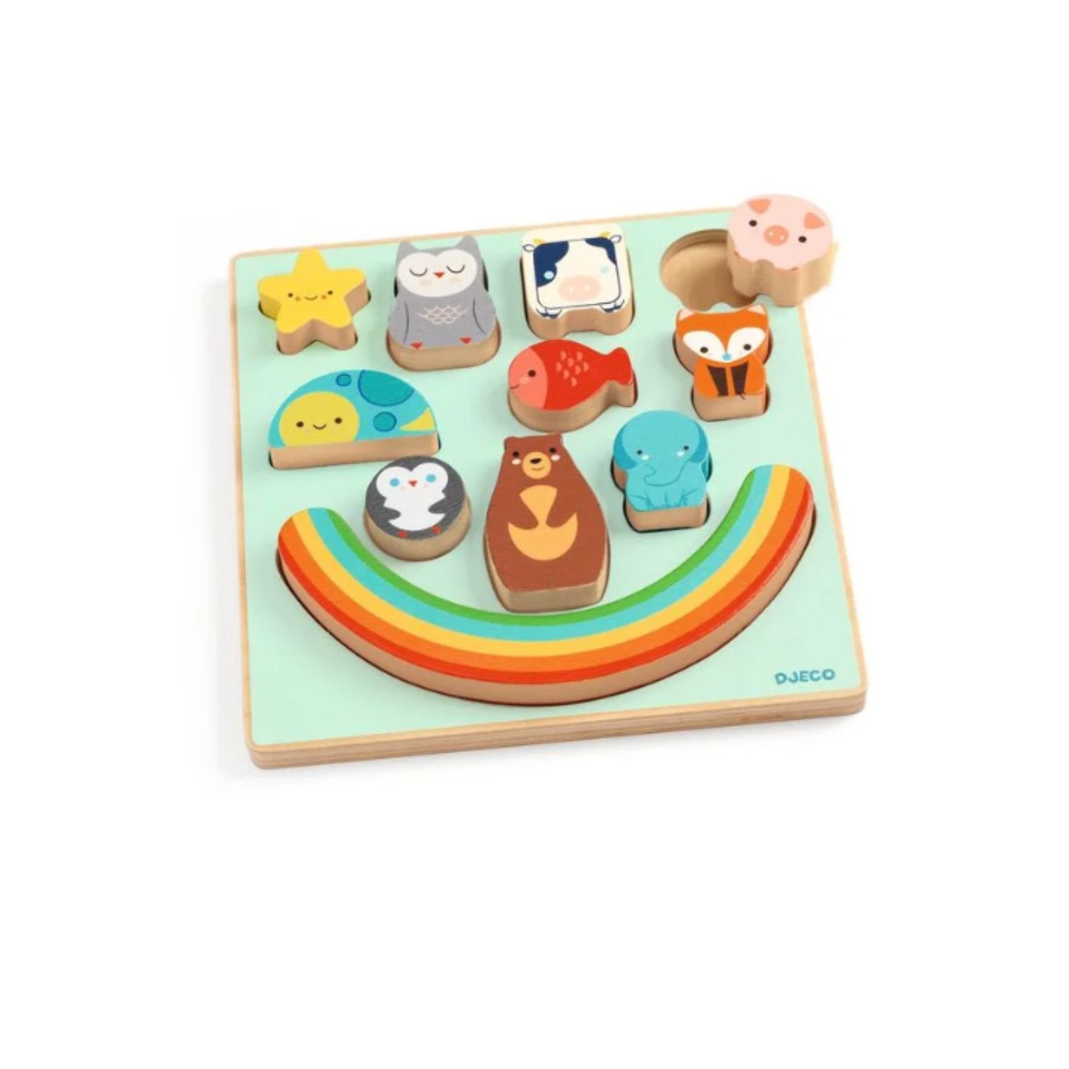 Un adorable puzzle en bois qui se transforme en jeu d’équilibre coloré ! Avec ses 11 pièces épaisses faciles à manipuler, ce jouet stimule la motricité fine et la créativité dès 18 mois. Parfait pour apprendre en s’amusant tout en développant patience et coordination.