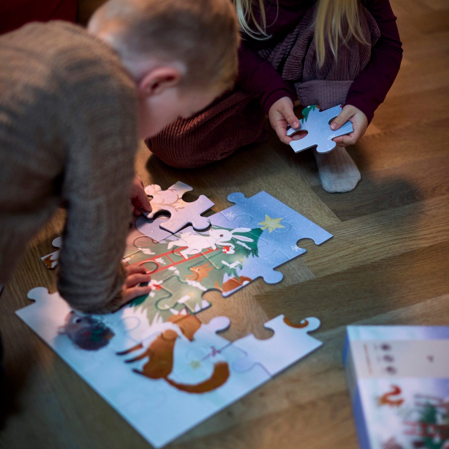 Ce puzzle Forest Friends de 30 grandes pièces invite les enfants dès 3 ans à plonger dans une scène enneigée remplie de tendresse : un sapin scintillant, des amis de la forêt et des étoiles qui dansent dans le ciel.