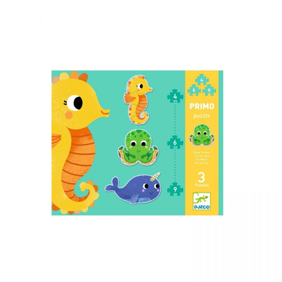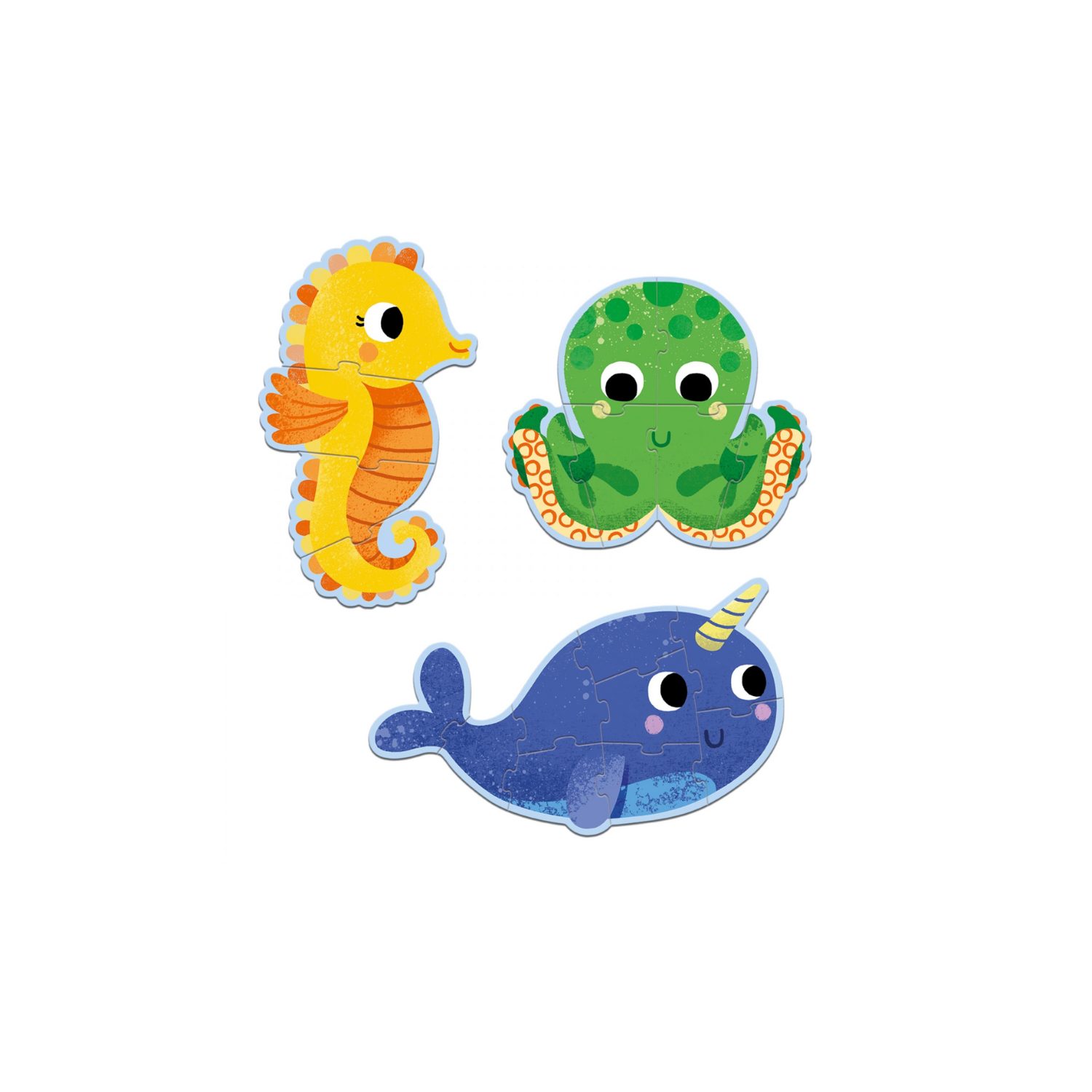 - Coffret contenant 3 puzzles évolutifs : hippocampe de 4 pièces, pieuvre de 6 pièces et baleine de 9 pièces.