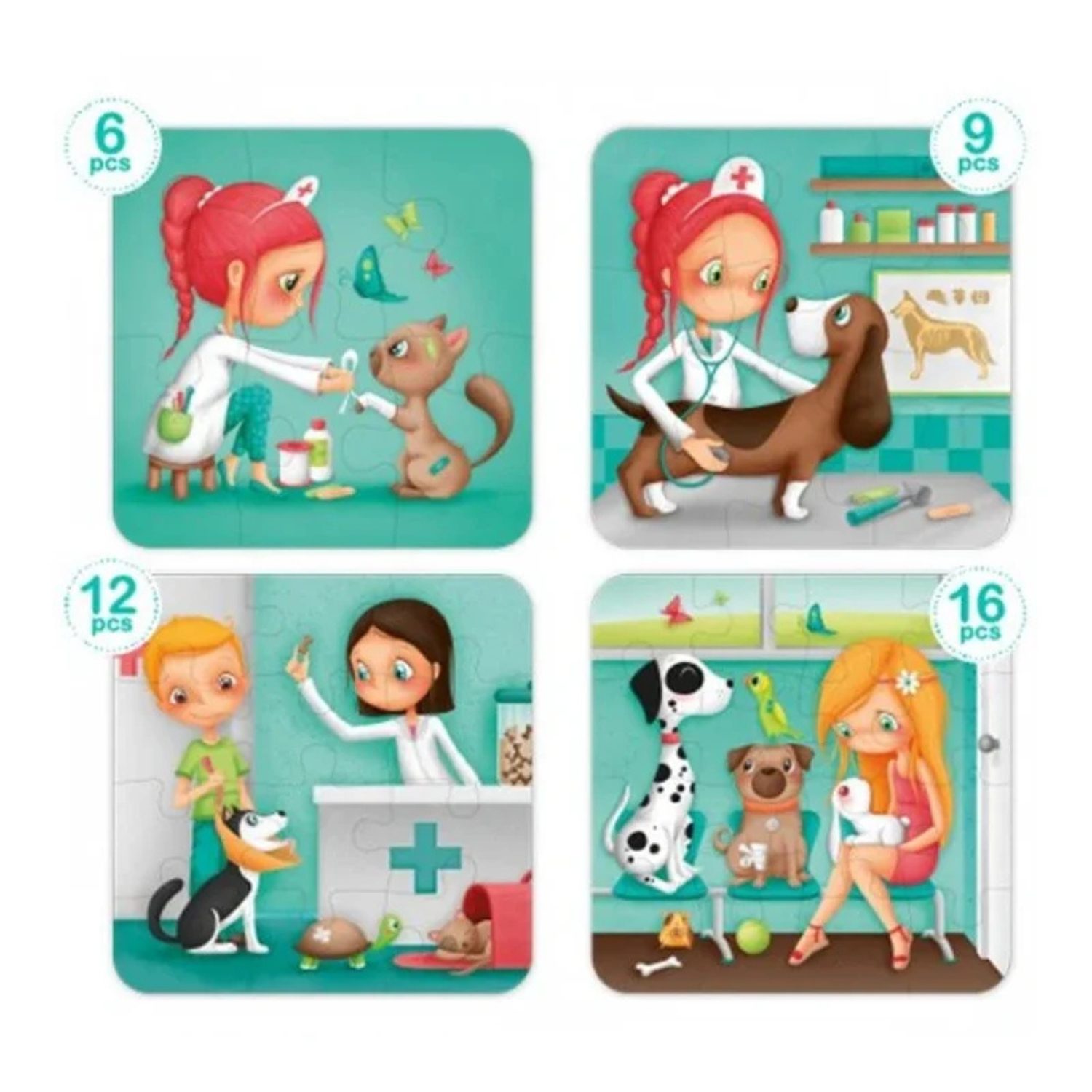 Les petits amoureux des animaux vont adorer ce coffret de puzzles sur le thème du métier de vétérinaire  ! Avec 4 niveaux de difficulté (6, 9, 12 et 16 pièces), l’enfant progresse à son rythme tout en s’amusant. Chaque puzzle représente des scènes du quotidien d’un vétérinaire, parfait pour développer sa logique, sa concentration et son observation.