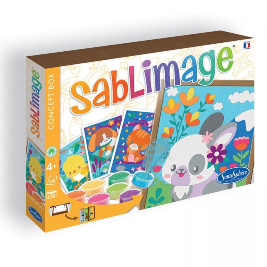 Ce coffret Sablimage Concept’Box invite les enfants à réaliser quatre jolis tableaux d’animaux tout doux : chat, lapin, écureuil ou encore petit chien. L’activité consiste à décoller les zones prédécoupées et à saupoudrer le sable coloré pour faire apparaître les illustrations. Grâce à son cadre intégré, chaque création peut être exposée une fois terminée. Un loisir créatif parfait dès 4 ans, pour un moment calme et amusant.