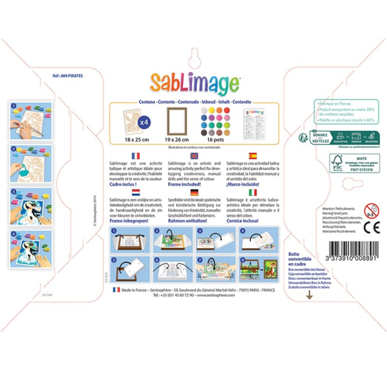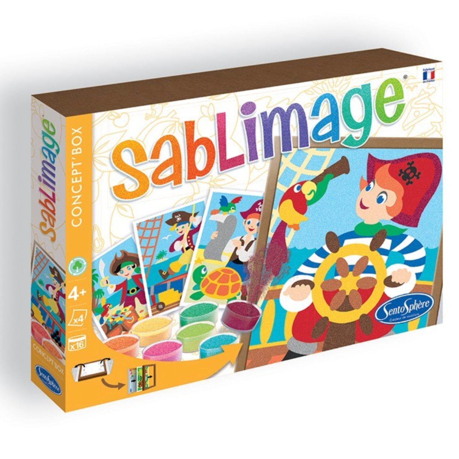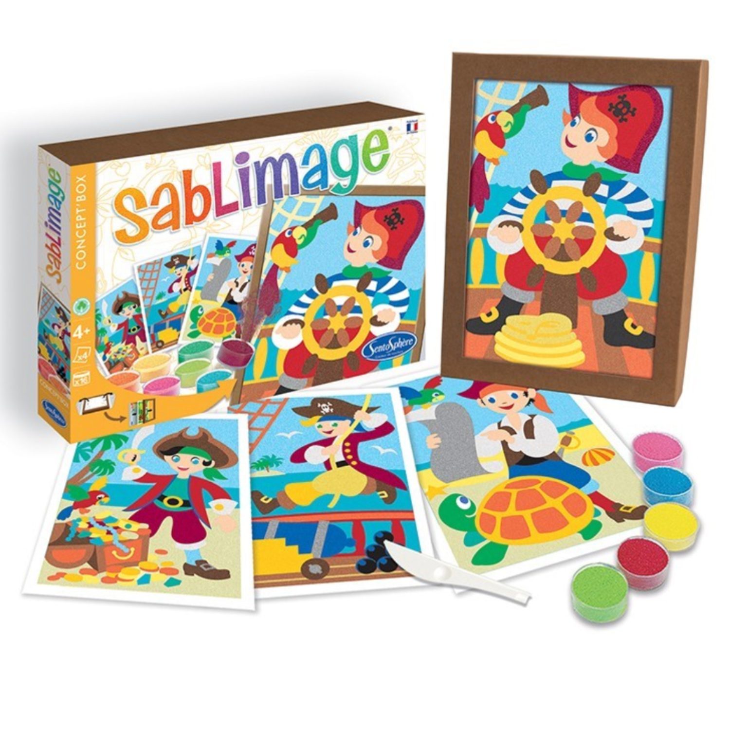 Ce coffret Sablimage Concept’Box plonge les enfants dans l’univers des pirates avec quatre tableaux à réaliser en sable coloré. Il suffit de décoller les zones prédécoupées puis de saupoudrer les couleurs pour faire apparaître de superbes scènes de trésors, navires et corsaires. Facile à utiliser et sans salissure, ce coffret promet des heures de créativité dès 4 ans. Le cadre intégré permet ensuite d’exposer fièrement les créations terminées.