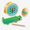 Ce set musical en bois invite les enfants dès 18 mois à découvrir les sons et le rythme à travers trois instruments : un tambourin, des maracas et des castagnettes.