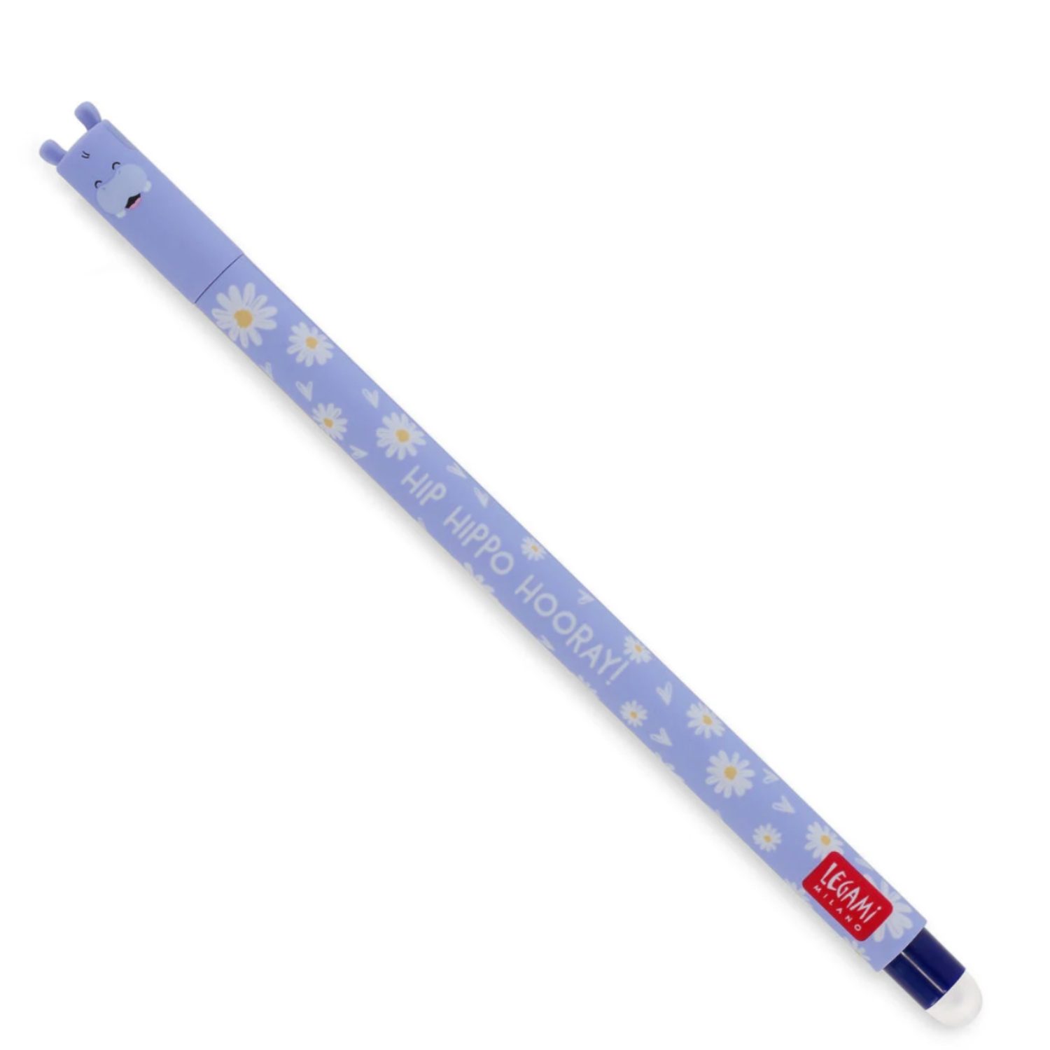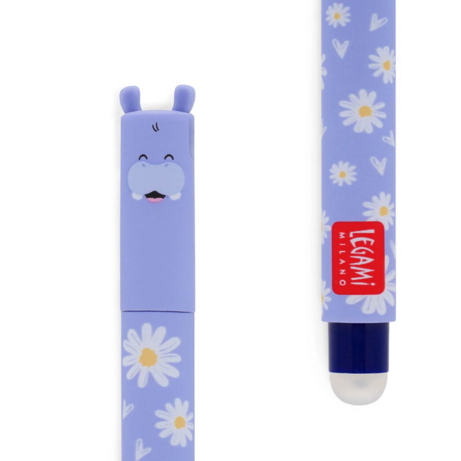 Le stylo effaçable hippopotame, c’est l’ami fun des apprentis écrivains : encre bleue effaçable, gomme intégrée, pointe fine 0,7 mm. Rechargeable, mignon, efficace.