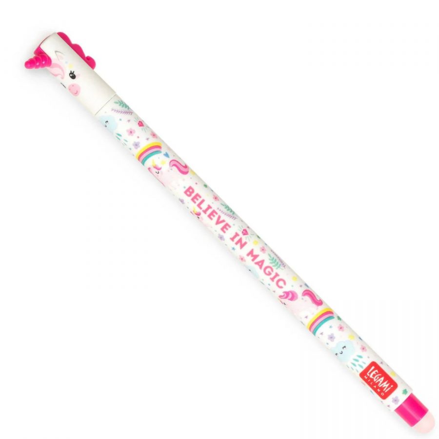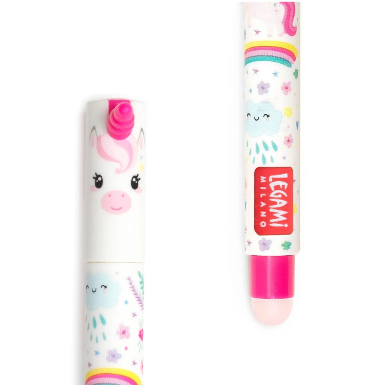 Un stylo effaçable tout droit venu d’un monde magique ! Licorne, encre rose thermosensible, gomme intégrée, pointe 0,7 mm. Pratique, mignon et rechargeable.