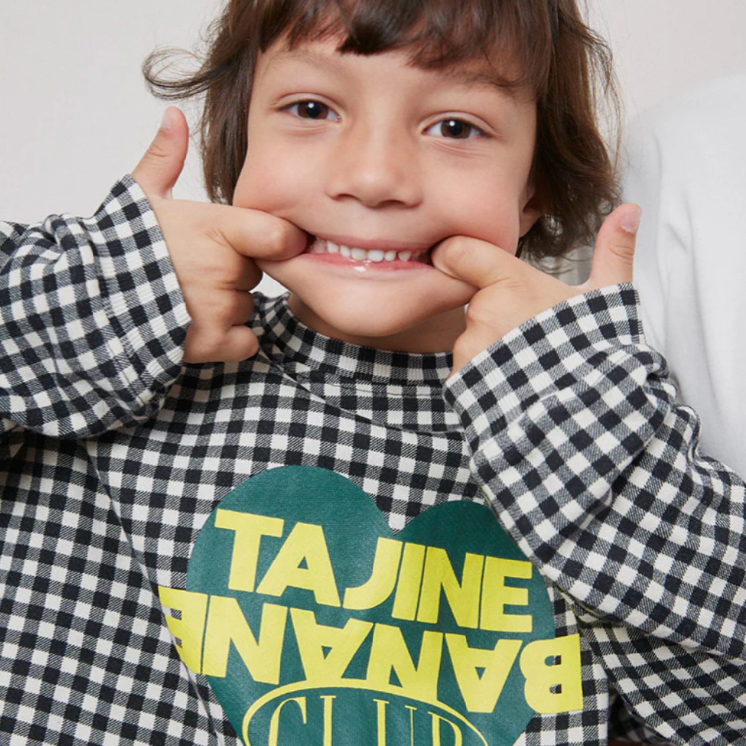 - Motifs : imprimé vichy + cœur “TAJINEBANANE CLUB” devant
