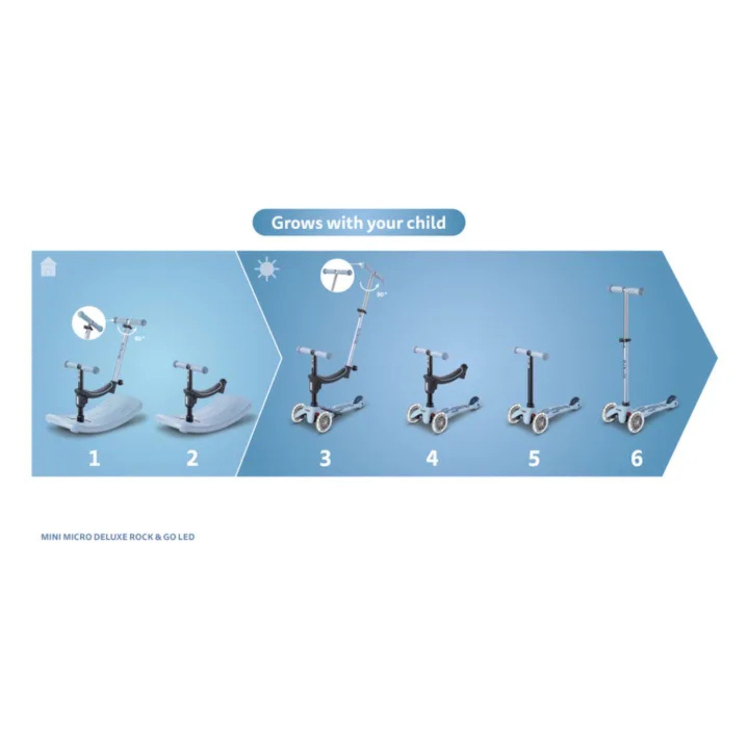La Mini Micro Deluxe Rock & Go LED est la première trottinette qui bascule, roule et accompagne votre enfant de 1 à 6 ans. Pensée pour évoluer avec lui, elle passe d’un siège à bascule à une véritable trottinette, sans outil, grâce à son système 6-en-1.