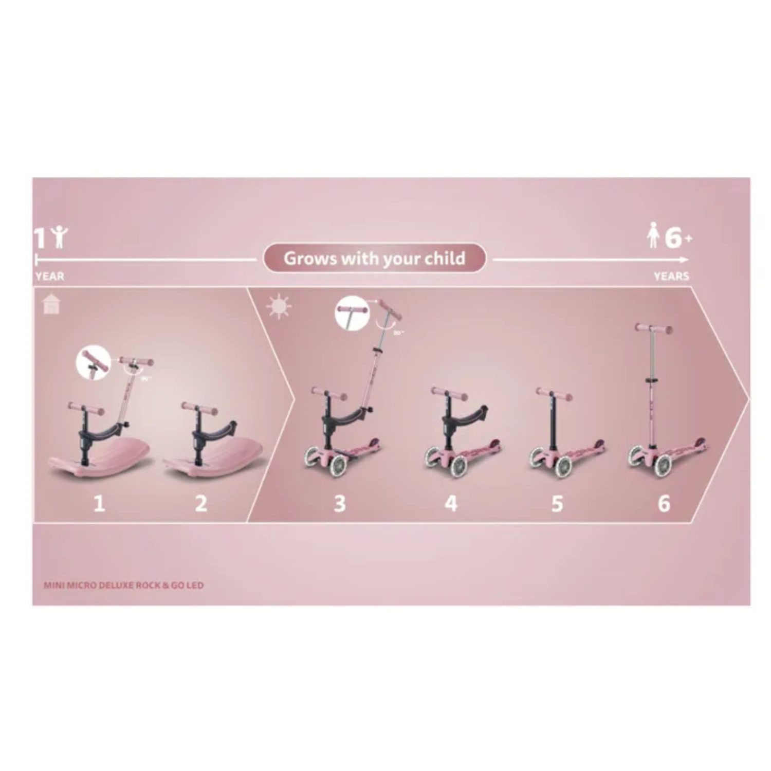 La Mini Micro Deluxe Rock & Go LED est la première trottinette qui bascule, roule et accompagne votre enfant de 1 à 6 ans. Pensée pour évoluer avec lui, elle passe d’un siège à bascule à une véritable trottinette, sans outil, grâce à son système 6-en-1.