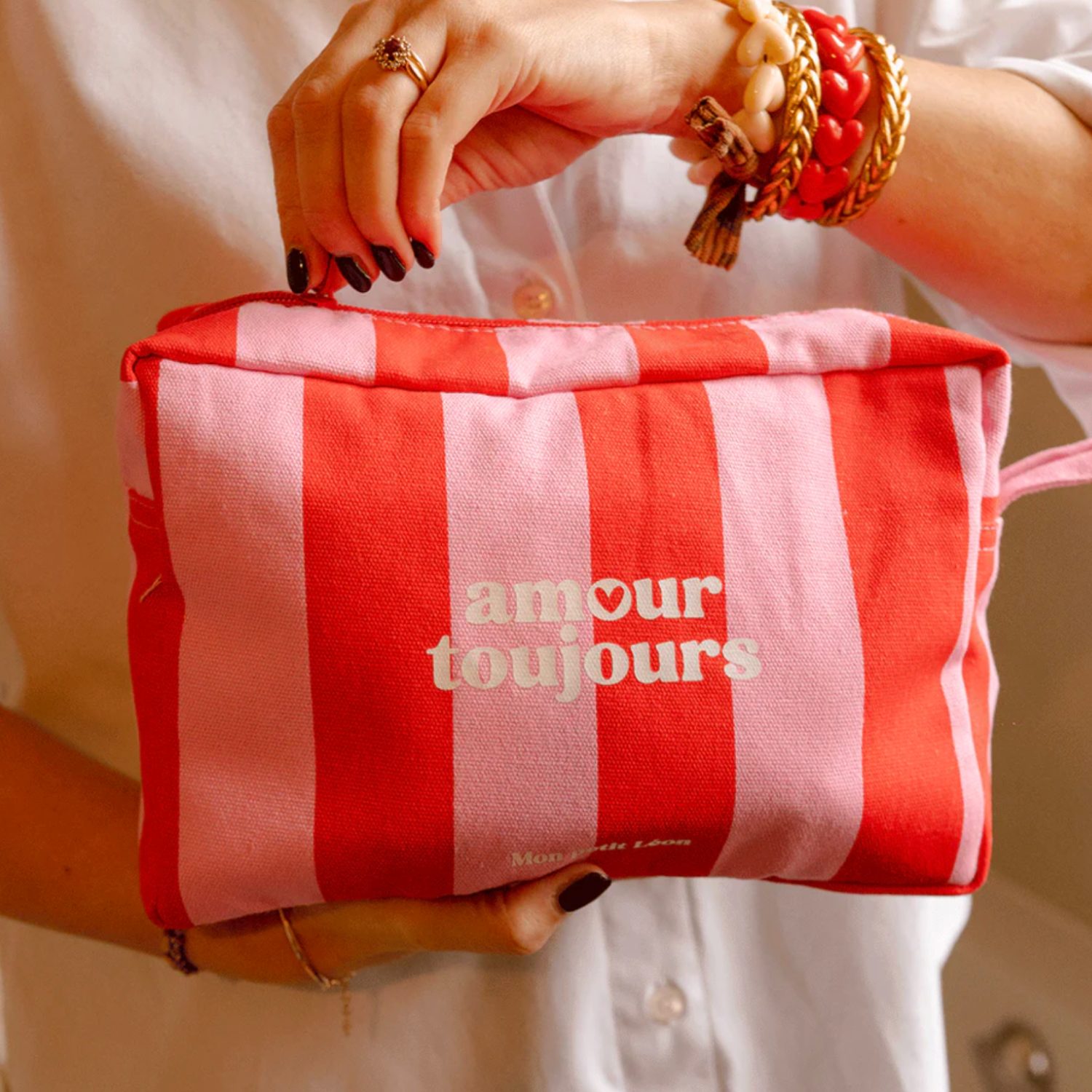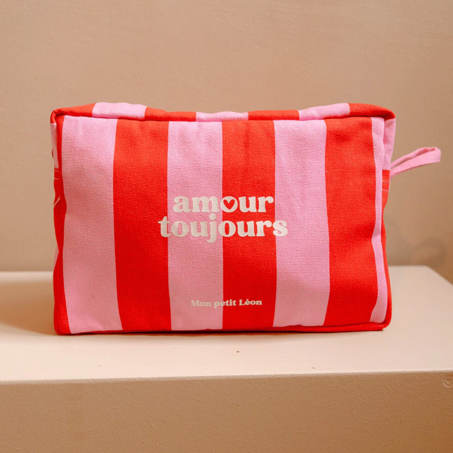 La trousse de toilette idéale pour organiser tous tes essentiels avec style. Avec ses rayures rose et rouge et le message Amour Toujours, elle apporte une touche colorée et joyeuse à tes routines du matin ou du soir.